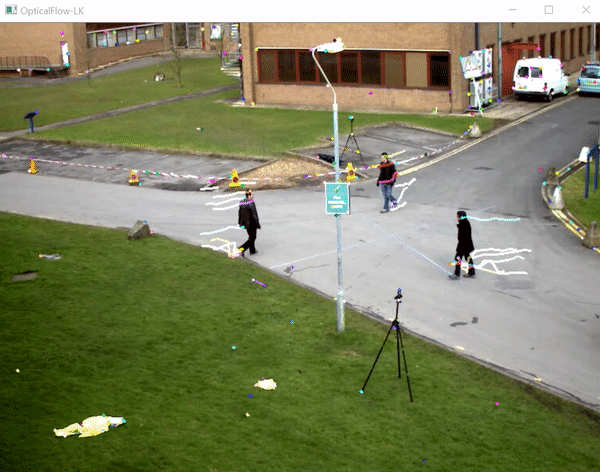 OpenCV는 루카스-카나데 알고리즘을 구현한 cv2.calcOpticalFlowPyrLK() 함수를 제공합니다.