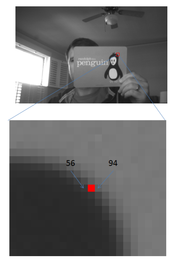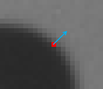 기울기 벡터란 영상 내 하나의 픽셀을 기준으로 주변 픽셀에 대한 기울기를 나타내는 벡터를 의미합니다. 말이 좀 어려운데 아래 예시 그림을 보겠습니다. 펭귄 머리 부분을 확대해보겠습니다.