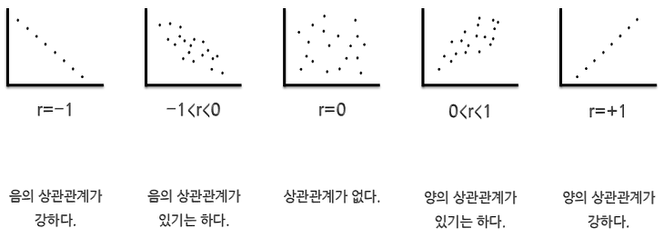 선형 회귀 그래프로는 산점도(Scatter plots)를 많이 활용합니다. 그리고 독립 변수와 종속 변수 간의 상관관계를 나타내는 척도를 상관 계수(correlation coefficient)라고 합니다. 상관 계수는 보통 r로 표기합니다. 여러 상관 계수가 있지만 선형 회귀의 상관 계수로 가장 많이 쓰이는 것은 피어슨 상관 계수(Pearson correlation coefficient)입니다. (피어슨 상관 계수와 스피어만 상관 계수의 비교는 본 링크(Reference2)를 참고하시기 바랍니다.) 피어슨 상관 계수는 선형 관계의 강도(Strength)와 방향(Direction)을 나타내며, -1부터 1 사이의 값으로 표시합니다. 선형 계수가 -1일 수록 음의 상관관계를 가지고, 1일 수록 양의 상관관계를 가집니다.