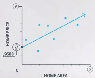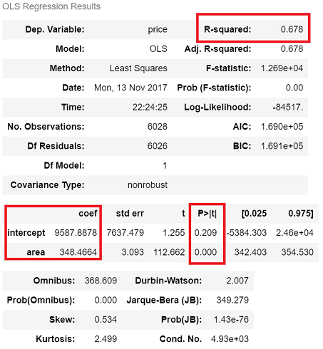 intercept의 coef는 9587.8878입니다. 이는 α=9587.8878라는 것입니다. area의 coef는 348.4664입니다. 즉, β=348.4664입니다. 따라서 선형 회귀식은 y = 9588 + 348X 입니다. (소수점 반올림함) y절편(intercept)이 9588이므로 area가 0일 때 price는 9588입니다. 또한, β=348이므로 area가 1 증가할 때마다 price가 348이 증가합니다.