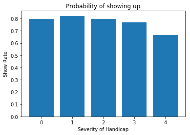 장애 수치가 높을 수록 No show 확률이 높습니다. 단, 0일때 No show 확률이 가장 낮지는 않습니다.